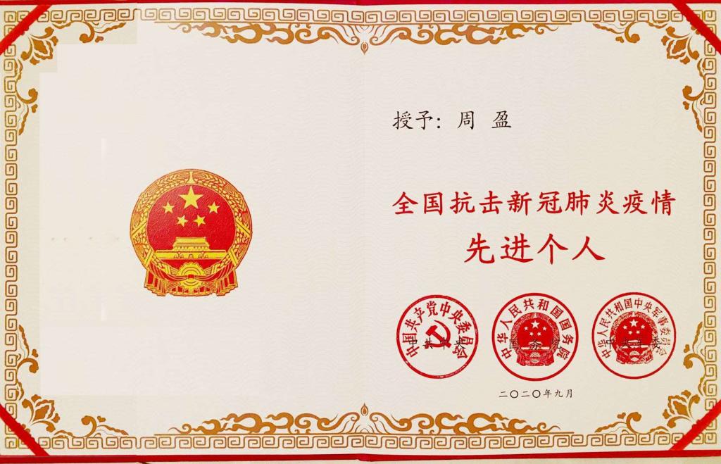 OK138太阳集团校友周盈获全国抗击新冠肺炎疫情表彰