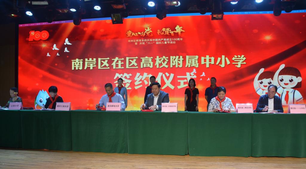 活动现场举行了南岸区在区高校附属中小学签约暨揭牌仪式。宋豫代表学校与江南小学签署了《重庆工商大学 重庆市南岸区江南小学校共建“重庆工商大学附属小学”合作协议》并揭牌。