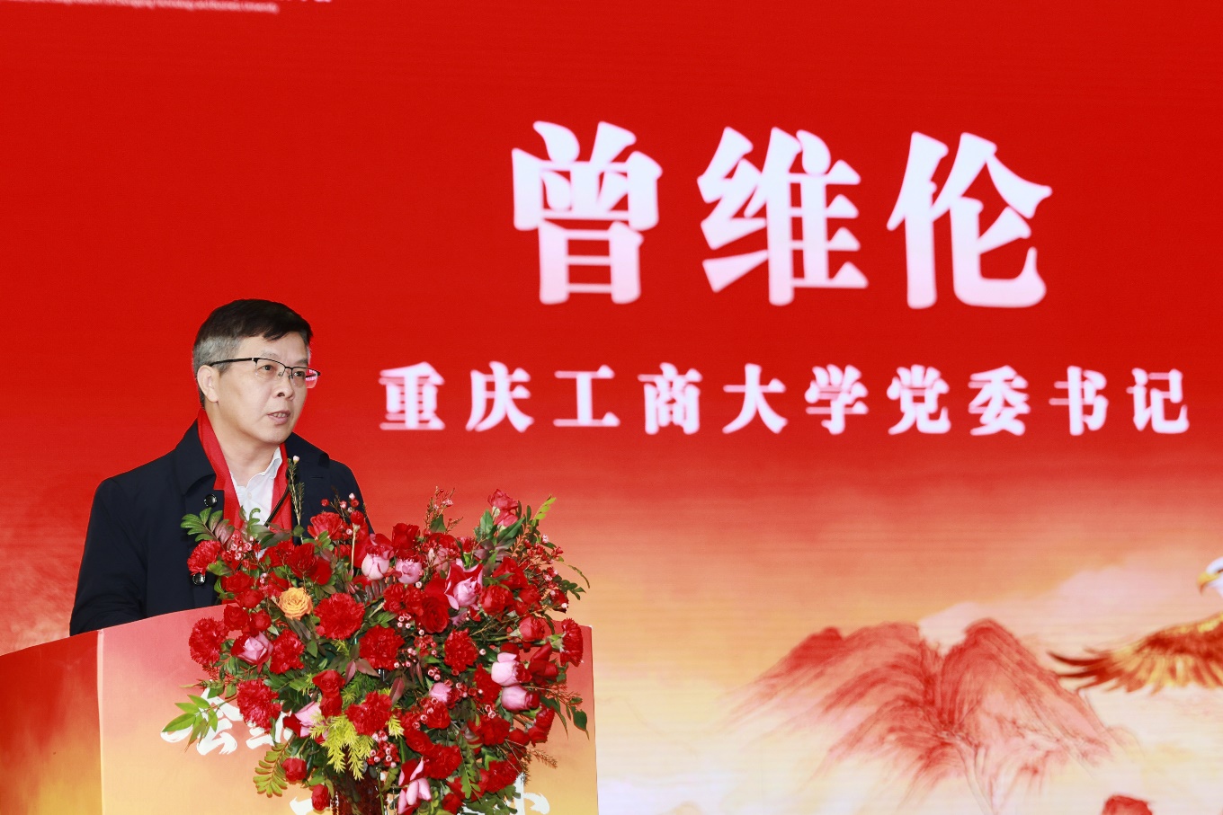 曾维伦代表学校向莅临年会的领导、嘉宾表示热烈欢迎,向长期以来关心支持学校发展的各级领导、广大校友、各界人士表示衷心感谢,向年会的主办协办分会、筹备校友、赞助企业表示诚挚谢意,并向大家提前送上新年的问候与美好祝愿。曾维伦指出,母校是校友美好的青春记忆、共同的精神家园,校友是母校最坚实的支撑、最亮丽的名片。73载的办学历程中,母校与校友学脉相承、文脉赓续,早已成为情感共同体、发展共同体和命运共同体。在致辞中,曾维伦向与会校友分享了“十四五”时期学校实现的历史性突破、取得的标志性成果,充分肯定了学校校友工作办公室统筹推进校友工作与校友会建设的成效,高度评价了海内外校友对母校建设与发展的守望相助。曾维伦强调,在“十四五”圆满收官、“十五五”新篇初展的历史交汇点上,海内外校友重返母校,共赴校友年会之约,承载着总结过往、擘画未来的特殊意义。年会的主题“会当凌绝顶,一览众山小”,既是广大校友赓续“含弘自强、经邦济民”重工商大精神的生动写照,更是对“坚韧、忠勇、开放、争先”重庆城市精神的深刻诠释与鲜活注脚。希望各位校友,胸怀登高望远的气魄,坚定攻坚克难的信心,以攀登者之姿同心聚力,以奋斗者之态砥砺前行,与母校一道携手续写“十五五”时期事业共同发展的崭新篇章。
