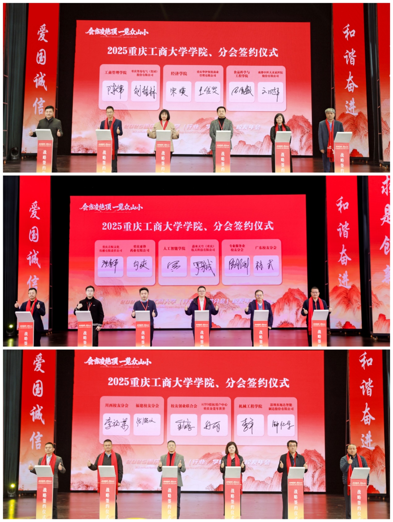 年会上,还举行了校企合作、校友企业合作、校友分会合作等签约仪式。学校经济学院党委副书记、院长宋瑛与重庆华伊贸投商业管理有限公司总经理王传贤校友;工商管理学院党委副书记、院长陈伟与重庆望变电气(集团)股份有限公司党委书记、副总经理刘柏林;人工智能学院党委副书记、院长申渝与蔚来天空(重庆)航天科技有限公司罗宋成校友;机械工程学院党委副书记、院长李平与深圳东旭达智能制造股份有限公司董事长钟仁东校友;食品科学与工程学院党委副书记、院长王星敏与成都中医大灵素医院股份有限公司董事长刘达平校友;校友创业联合会执行会长金赵亮与重庆途峰爱拓汽车销售有限公司向丽;专业服务业校友分会秘书长潘理科与广东校友分会会长林武;川西校友分会会长李福荣与福建校友分会副会长张海文;重庆青鲸文化传播有限责任公司执行董事兼总经理廖李平校友与重庆亚锋药业有限公司勾爽校友代表所在的单位和分会签约。