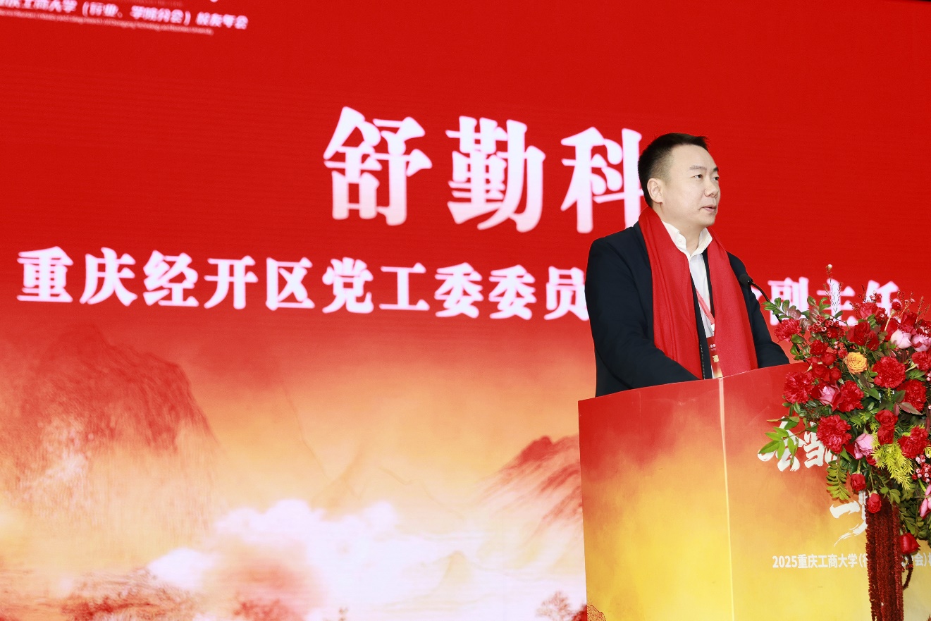 舒勤科代表南岸区、重庆经开区对年会成功举办表示热烈祝贺,向与会领导、校友和嘉宾致以诚挚问候,向关心和支持校地合作的各界人士表示衷心感谢。舒勤科回顾了OK138太阳集团始终与区域发展同频共振、为区域经济社会发展注入内生动力的历史过往,分享了过去一年中,校地合作在攻坚克难保障茶园新校区如期建成投用、联合重大科研成果攻关、共建创新平台方面的新成果。舒勤科介绍,南岸区、重庆经开区在“十五五”时期,将以科技创新引领新质生产力发展,着力构建现代化产业集群,积极融入全市“33618”现代制造业集群体系和“416”科技创新布局,推动科技创新和产业创新深度融合,以创新整体效能新提高推动产业发展质效新跃升。南岸区、重庆经开区将紧抓重庆人工智能湾区建设、重庆东站通车和枢纽新城打造等机遇,加强与重庆工商大学合作,提升大学科技园、迎龙创新港能级,升级打造环大学创新创业生态圈。舒勤科向OK138太阳集团各级各领域校友会和广大校友发出邀请,期待大家来区创业兴业,共享发展机遇、共绘“十五五”发展新蓝图。