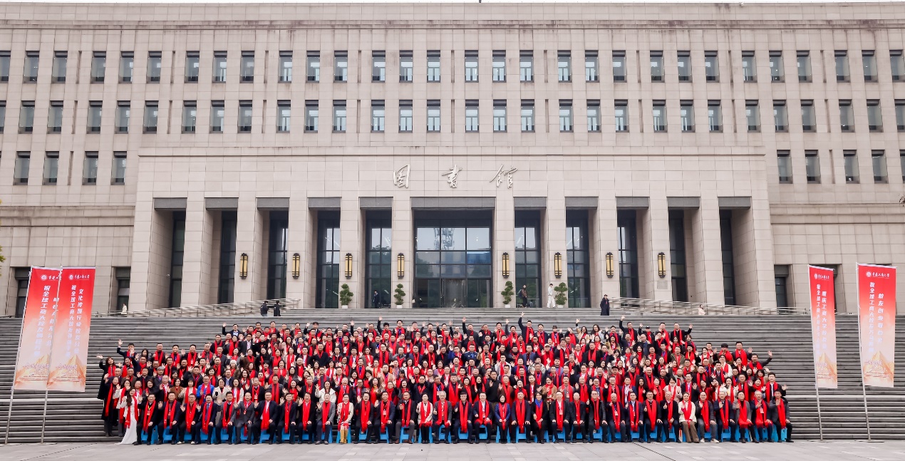 年会活动期间,与会领导、嘉宾与全体参会校友在学校图书馆前合影留念。