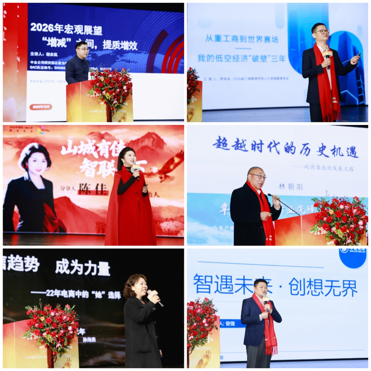 中金公司资深研究员谢余胤,2006级人力资源管理专业校友、蔚来天空(重庆)航天科技有限公司总经理罗宋成,2005级广告专业校友、璞萨文化创始人陈佳,1980级机械制造专业校友、重庆耐德集团董事长林朝阳,1999级商务策划专业校友、重庆聚沙成塔数字供应链管理有限公司总经理孙海燕,2008级企业管理专业校友、华智未来(重庆)科技有限公司总经理曾强分别以“2026年宏观展望:‘增减’之间,提质增效”“从重工商到世界赛场:我的低空经济‘破壁’三年”“山城有佳智联天下”“超越时代的历史机遇:耐德集团的发展之路”“相信趋势 成为力量:22年电商中的‘她’选择”“智遇未来·创想无界”为主题展开了分享。