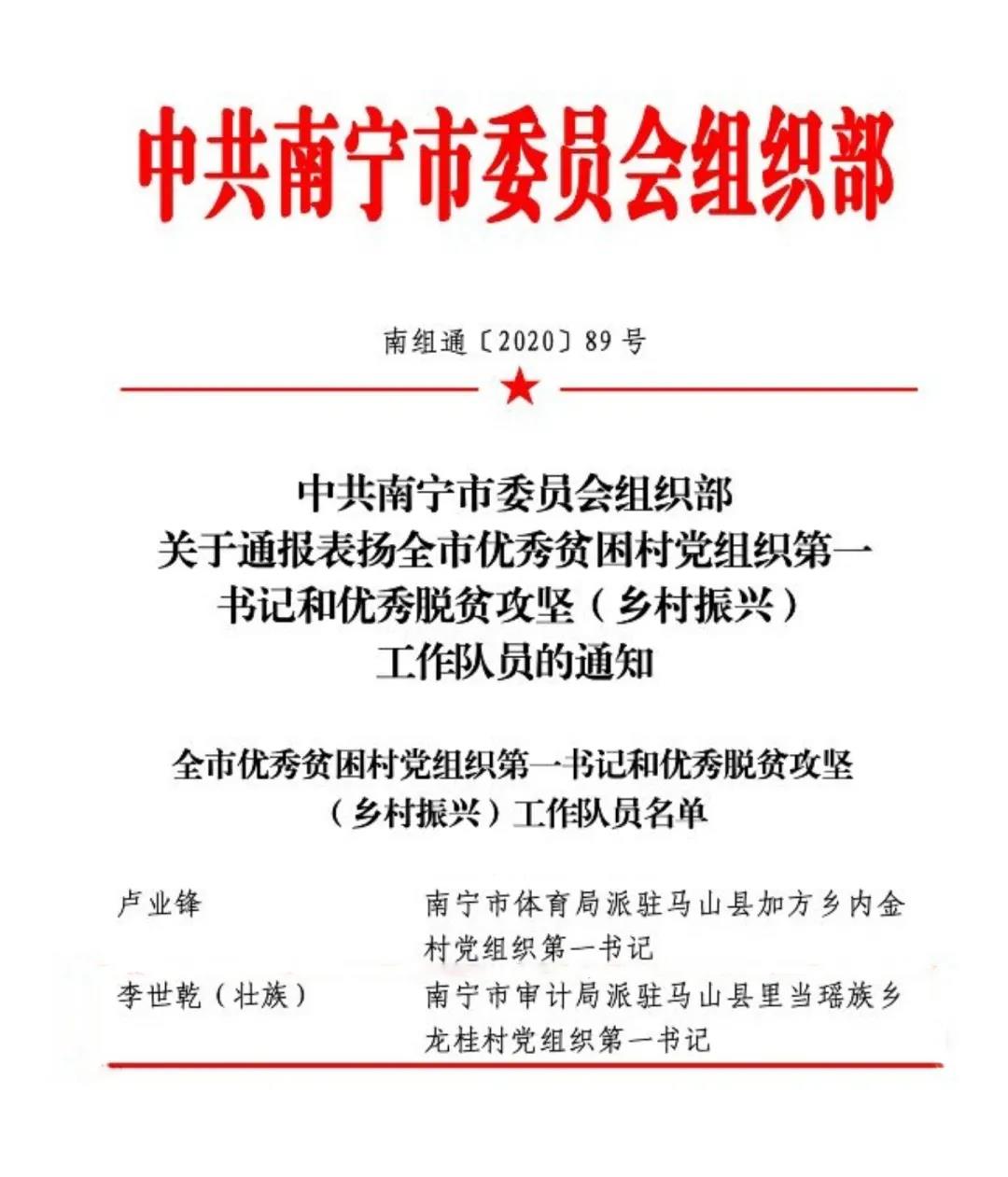 李世乾的辛勤付出得到了组织的表彰与认可,荣获“南宁市优秀贫困村党组织第一书记”、“南宁市脱贫攻坚先进个人”称号。