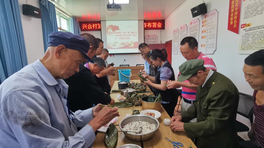 活动中,村支部书记首先以集中领学的方式全体党员进行理论学习,集中学习了习近平总书记在文化传承发展座谈会的重要讲话精神,参会党员分别围绕讲话精神,以端午等传统节日习俗的传承变迁进行交流。随后,全体党员重温入党誓词。各位党员们佩戴好党徽,在领誓人的带领下,面对鲜红的党旗,举起右手,握紧拳头,以饱满的精神、铿锵有力的声音庄严宣誓。在每一句的誓言里,都提醒着各位党员们保持自身的纯洁性和先进性,勠力同心,汇聚力量,充分发挥村支部战斗堡垒作用,奋力开创推进乡村振兴工作新局面。驻村第一书记赵甫刚讲《端午节习俗的传统文化内涵和时代内涵》微党课。党课讲了端午节由来、习俗等所形成的传统文化内涵及爱国主义情怀,增强党员的文化自信和爱国主义情怀。党员们围在摆上准备好的糯米、粽叶、蜜枣等材料的桌旁。准备计时包粽子比赛。只见有熟练者手拿粽叶,麻利地将粽叶裹成小漏斗形状,填入糯米、红枣,压实、封口、扎捆,一个有棱有角的鲜绿色粽子便瞬间成型。有第一次包粽子接连出着“洋相”,惹得大家欢笑不断。大家一边包着粽子,一边交流端午节的习俗。红豆蜜枣的香甜味,粽叶的缕缕清香,充满了会议室,其乐融融。