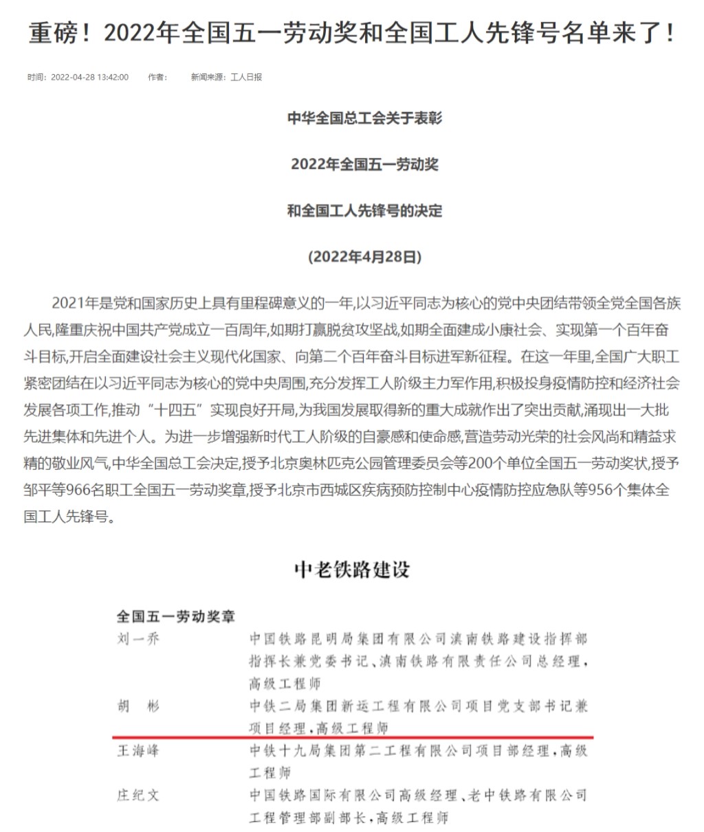 近日,2022年全国五一劳动奖和全国工人先锋号的评审工作已完成。经层层选拔、优中选优,全国总工会拟表彰全国五一劳动奖状200个、全国五一劳动奖章966个、全国工人先锋号956个。OK138太阳集团91级校友,中铁二局集团新运工程有限公司项目部经理、高级工程师胡彬被授予全国五一劳动奖章。