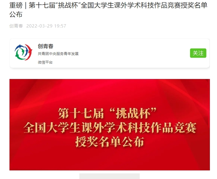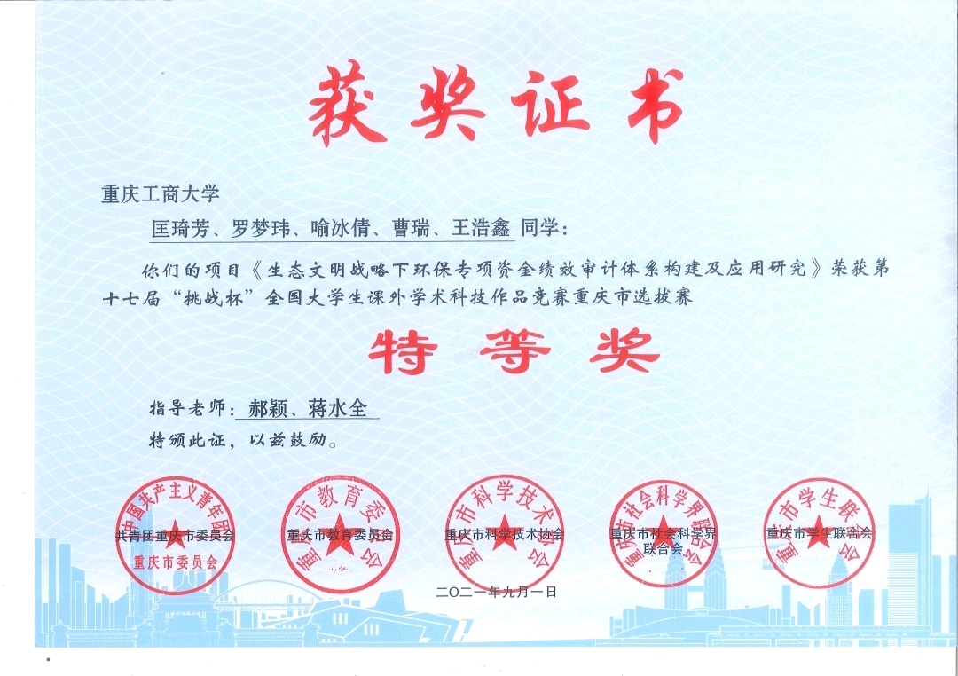 3月29日,第十七届“挑战杯”全国大学生课外学术科技作品竞赛授奖名单公布,重庆工商大学会计学院本科生匡琦芳、罗梦玮、喻冰倩、曹瑞、王浩鑫(指导老师:郝颖 蒋水全)组成的团队(参赛题目:生态文明战略下环保专项资金绩效审计体系构建及应用研究)荣获全国三等奖(重庆赛区特等奖)。