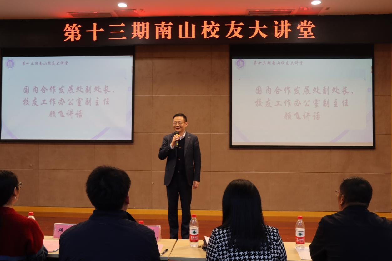 为了深入贯彻落实习近平总书记关于促进高质量充分就业的重要指示精神,11月7日,由校友工作办公室、外国语学院共同主办的第十三期南山校友大讲堂——“精绘职业蓝图,畅享辉煌生涯”在图书馆多功能厅开讲。1993级英语专业校友、中国建设银行重庆万州分行党委书记、行长甘伟,2001级英语专业校友、成都美迪教育科技有限公司重庆渝北分公司校长邓霞,2007级英语专业校友、中建新疆建工集团(重庆)建设有限公司总部党支部副书记、综合办公室主任费青,2012级翻译专业校友、重庆宗申集团进出口有限公司产品销售经理李亚洲以及外国语学院党委书记、副院长彭勇,外国语学院院长周琳,国内合作发展处副处长、校友工作办公室副主任顾飞等应邀出席。多功能厅座无虚席,来自学校各专业的百余名学生参加了本次活动。活动由2023级人力资源管理专业解平月同学主持。
