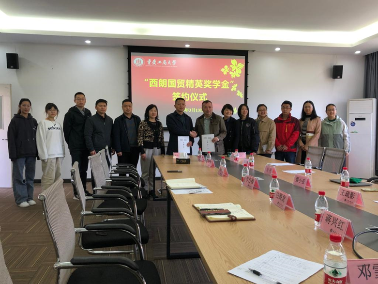 3月13日,重庆工商大学“西朗国贸精英奖学金”捐赠仪式在田家炳406会议室举行,学校国内合作处处长刘代成代表学校教育发展基金会与重庆西朗进出口贸易有限公司刘丹总经理签署捐赠协议。重庆西朗进出口贸易有限公司联合创始人粟小亚、人事专员李园琴,经济学院副院长尹元福,学院党委副书记白海龙,校友办张如强,国贸系主任蒋兴红,教师代表王疏影博士,辅导员张涛、邓雪霜和学生代表参加了捐赠仪式。经济学院党委书记李自维主持仪式。