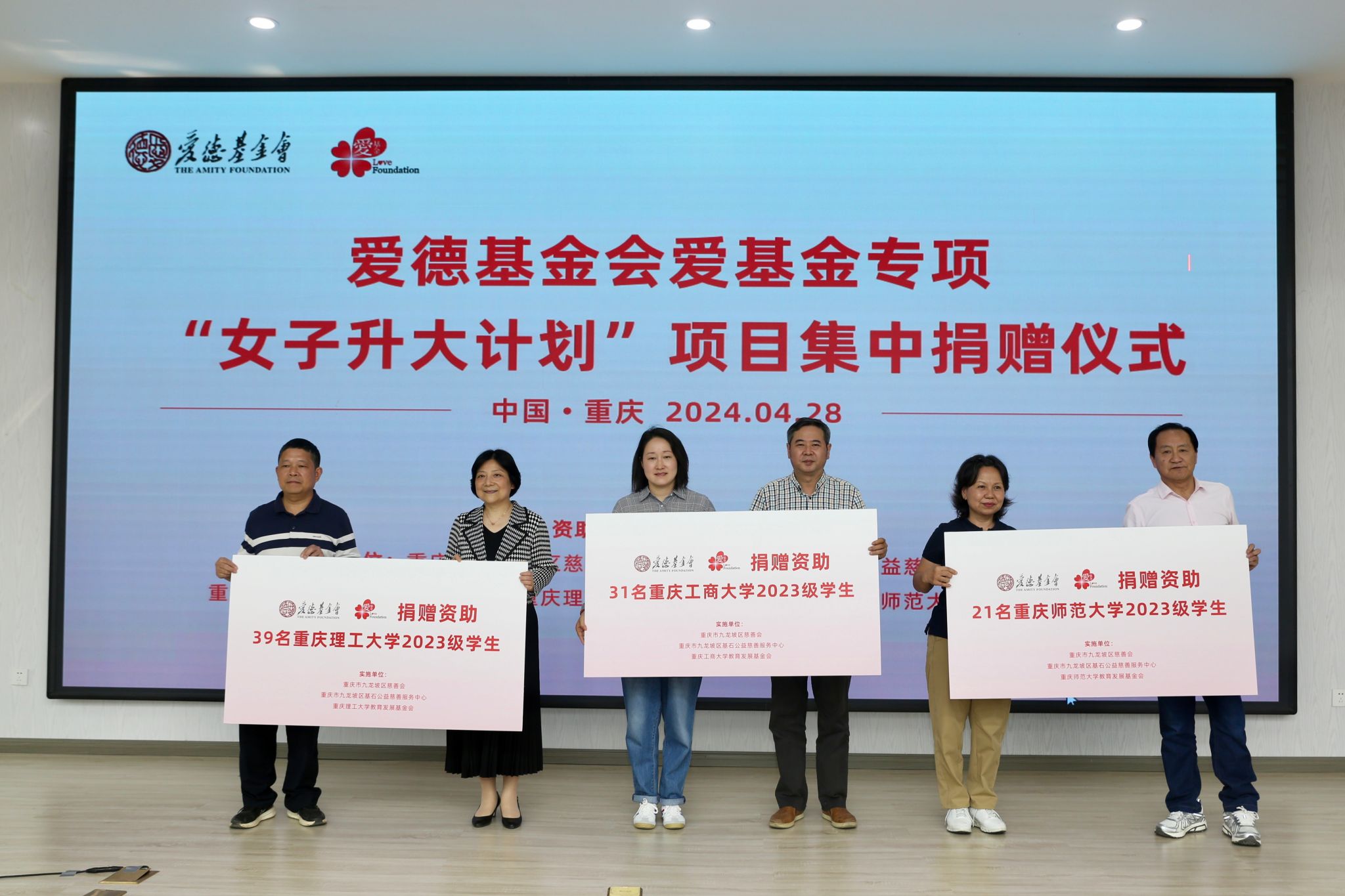 据悉,“女子升大计划”项目是爱德基金会于2006年发起的教育助学项目,目的是帮助家庭经济困难的优秀女大学生完成学业,鼓励受助女大学生参与社会服务,培养健康的人格和自立自强的品质。今年该项目首次落地重庆,由九龙坡区慈善会、九龙坡区基石公益慈善服务中心联合重庆工商大学教育发展基金会、重庆理工大学教育发展基金会、重庆师范大学教育发展基金会共同实施。