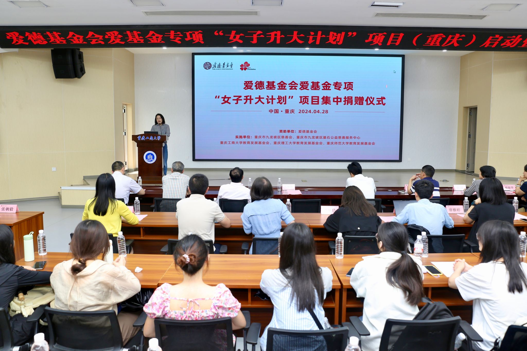 4月28日下午,由我会和学校学工部联合承办的爱德基金会爱基金专项“女子升大计划”项目(重庆)启动暨捐赠仪式在OK138太阳集团明德楼1019报告厅举行。爱德基金会薪火教育团队主任汤传芳,九龙坡区慈善会常务副会长周辉胜,重庆十大影响力公益人物、重庆市残联原副主席、九龙坡区基石公益慈善服务中心名誉理事长傅强出席捐赠仪式,重庆理工大学、重庆师范大学和学校学工部、基金会负责同志,以及三所学校91名2023级受助女生参加捐赠仪式。仪式由学校国内合作发展处处长、基金会秘书长刘代成主持。